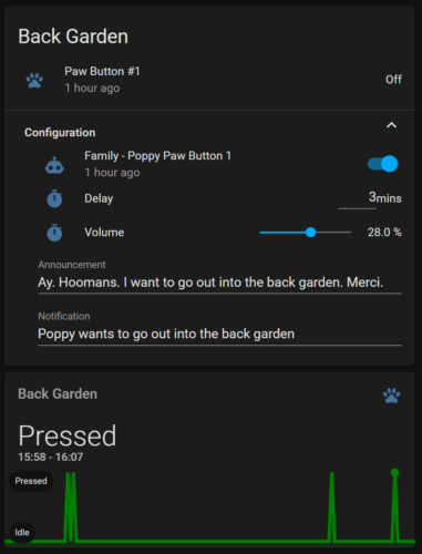 As I made three of these buttons I currently have them set up to notify me when Poppy wants to go play in the garden, one near her lead for when she wants to go on a walk and the other with her food.