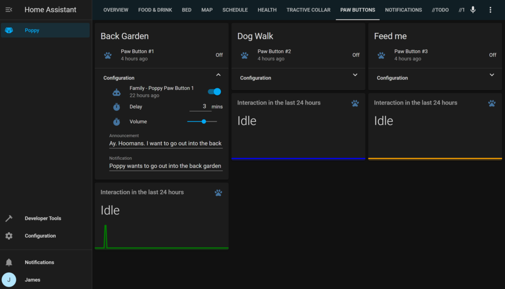Poppy has her own pretty cool dashboard where we track her health, food, and diet as well as her location from her LTE GPS collar. The buttons I made reside in their own Lovelace view in her dashboard.
